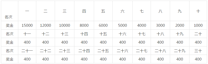 1、男、女組按芯片計(jì)時(shí)成績(jī)分別錄取前30名進(jìn)行獎(jiǎng)勵(lì)(見(jiàn)表,單位:人民幣);前三名獲得者各獲名次獎(jiǎng)牌一枚。